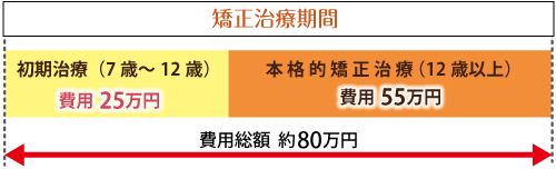 上の図の様に、初期治療(7歳~12歳)の間に治療を行う事で、本格的矯正治療に進まずに済むお子さんもいらっしゃいます。この初期治療の段階で矯正を始める事がとても大切です。図の様に、初期治療だけで済んだ場合は、矯正治療費用は25万円となります。(診断料など別途)。自分のお子さんの歯並びを綺麗にしてあげたい、けれど治療にかかる費用を抑えたい・・・という親御さんは多くいらっしゃいます。